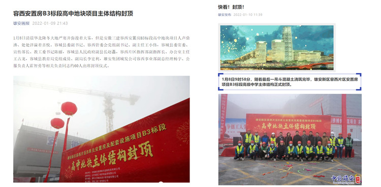 此外,人民雄安網《雄安容西片區高中封頂、未來可容納1920名學生》、新浪網《雄安新區容西片區B3標段高級中學主體結構封頂》、中國雄安官網《看建雄安丨容西片區B3標段高級中學主體結構封頂》以及河北日報報業集團、雄安發布、澎湃新聞等多家媒體官網、公眾號、微博客戶端對此次封頂儀式進行了宣傳報道,贏得點贊紛紛。