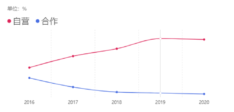 公司自 2015年采取“堅持自營、減少聯營”政策以來,自營率逐年提高,2015年自營率約60%,2020年自營率已達到94%以上。