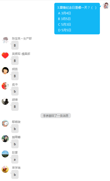 本次知識競賽內(nèi)容涵蓋雷鋒同志的事跡、生平及榮譽。競賽項目設(shè)置為單選題、多選題、填空題三個題型。團支部在團員群里面發(fā)送題目,題目發(fā)送后第一位答對題目的即為優(yōu)勝者。競賽前,青年團員們都積極熟悉雷鋒精神有關(guān)知識點;比賽中,大家都積極答題、沉著應(yīng)對、密切配合。本次知識競賽活動讓青年團員們了解了雷鋒精神,并致力將其內(nèi)化于心,外化于行,進一步學(xué)習(xí)和弘揚雷鋒精神。
