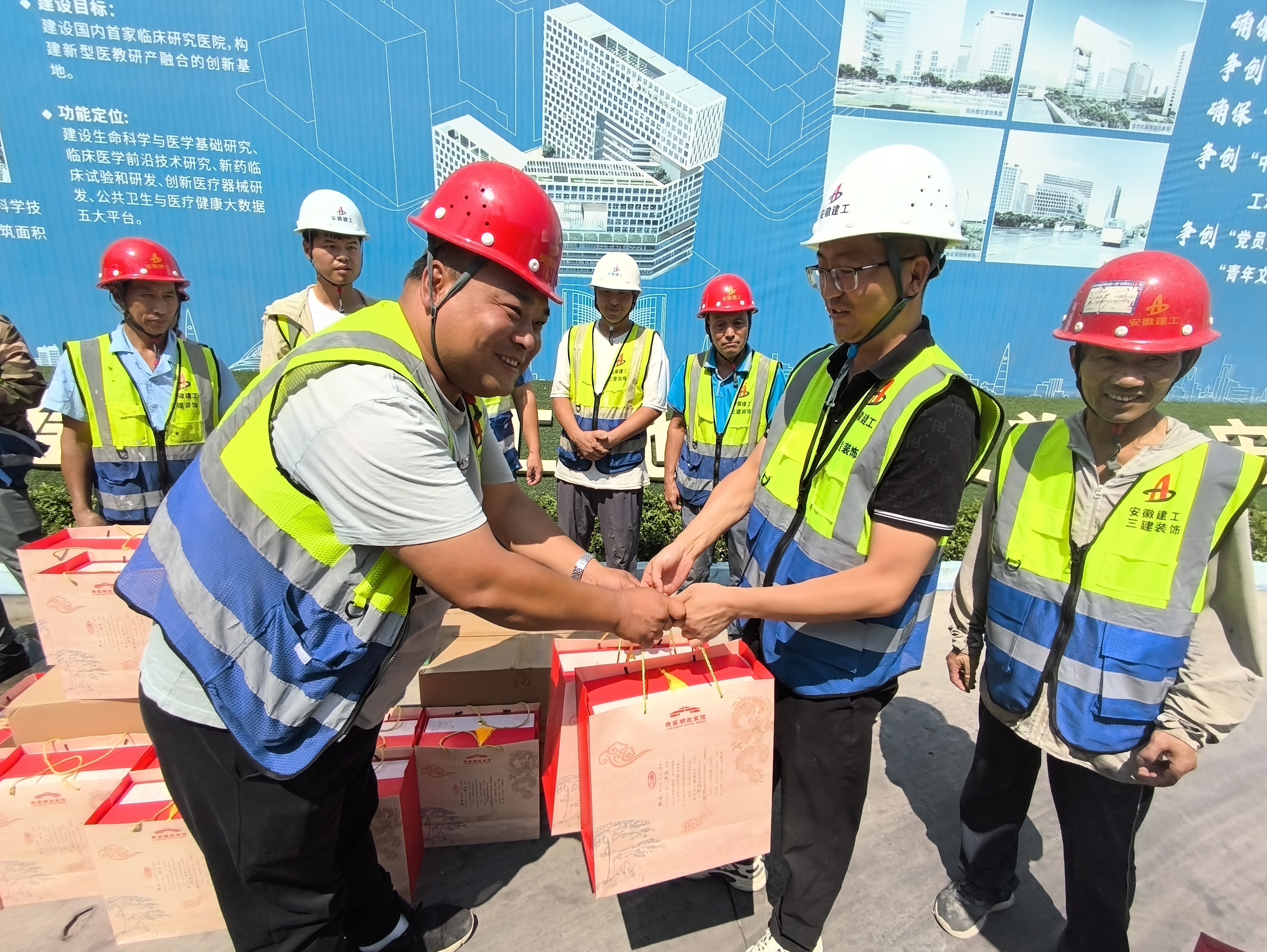 佳節(jié)“不打烊”,奮力“搶進(jìn)度”。中科院項(xiàng)目建設(shè)者們搶抓工期,在這個(gè)闔家團(tuán)圓的重要節(jié)日,主動(dòng)放棄與家人團(tuán)聚的機(jī)會(huì),在項(xiàng)目上揮灑汗水、辛苦付出,為城市的現(xiàn)代化建設(shè)默默奉獻(xiàn)著。裝飾公司開(kāi)展慶中秋慰問(wèn)活動(dòng),為建筑工人們送上中秋月餅和中秋祝福。